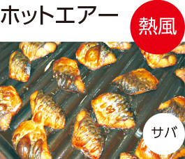 表面の温度は100℃以上になるので、食品表面の水分が蒸発(高温乾燥空気の乾燥過程)し、カリッと焼きあがる。一方、水蒸気の粒は食品の中まで浸透し加熱するので、中身はしっとりとしたまま温まる。