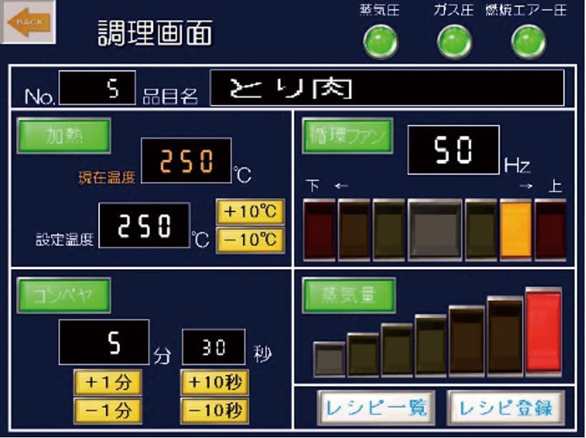 運転やモードの切り替え、温度やコンベヤ速度の調整など主要な操作は、液晶タッチパネルで指一本で行えます。複雑な操作はなく、どなたでも簡単に調理温度、調理時間、循環パワー、モード選択を変更できます。さらにメニュー登録100品目、エラー情報表示、各種手動運転が可能です。