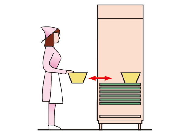 上下する収納棚を任意の位置で停止させられるので、作業しやすい位置を選べます。また、手の届かない高さまで収納できるため大量の消毒保管が可能になり、省スペースに貢献します。