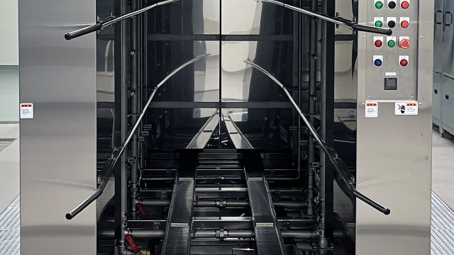コンテナを入口のコンベヤ上にセットするだけで続けて洗浄できる連続方式。