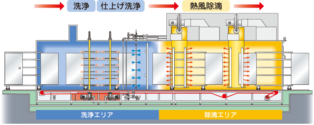 洗浄機内を搬送する間に主洗浄、仕上げ洗浄、さらに除滴まで全工程を自動処理します。