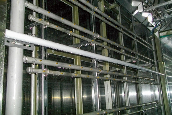 内部では、両サイドと上部から洗浄湯を隅々まで高密度で高圧ジェットスプレー。洗浄ノズルは噴射範囲の広い扇形ノズルを配列しているので、洗浄死角はほとんどありません。コンテナの外壁はもちろん内部や棚を洗浄します。