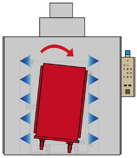 コンテナを傾斜させた状態で洗浄・除滴を行うことで、より死角のない洗浄、効果的な除滴を行います。
