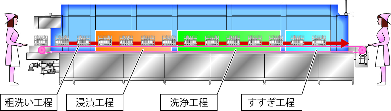 浸漬せずに洗浄でき、水をリサイクル構造に取り入れて節水