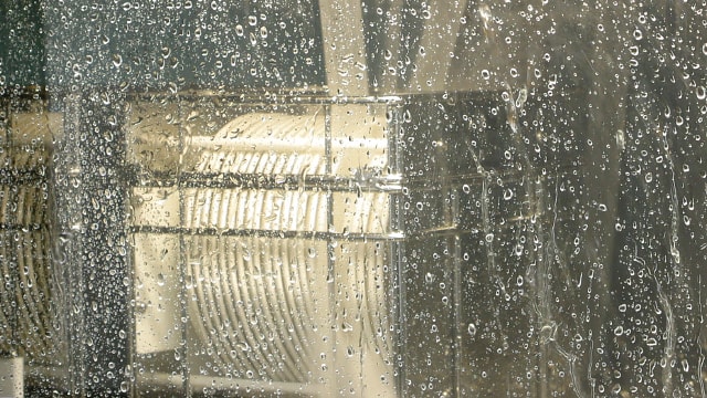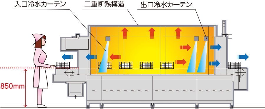 二重断熱構造(本体や扉)と入口と出口の冷水カーテンで、熱や湯気を閉じ込めます