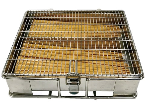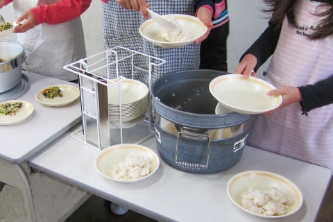 食器類が飛び出さないよう蓋と4本の支持棒で固定し、児童生徒の負担に配慮した軽量かつ丈夫な構造です。
