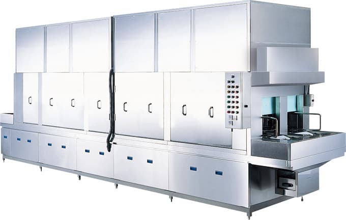 - 番重やコンテナ専用に縦置きで洗浄するタイプと、食器なども洗浄できる伏置きタイプがあり、いずれも洗浄物の両面から洗浄水をスプレーしてパワフル洗浄を行います。