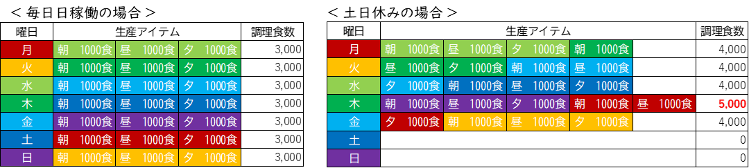 毎日製造であれば、毎日均一な製造量(=作業量)となりますが、土日休みだと厨房の規模は5000食の規模での設計、日により製造数が異なるので人員配置も検討する必要があります。